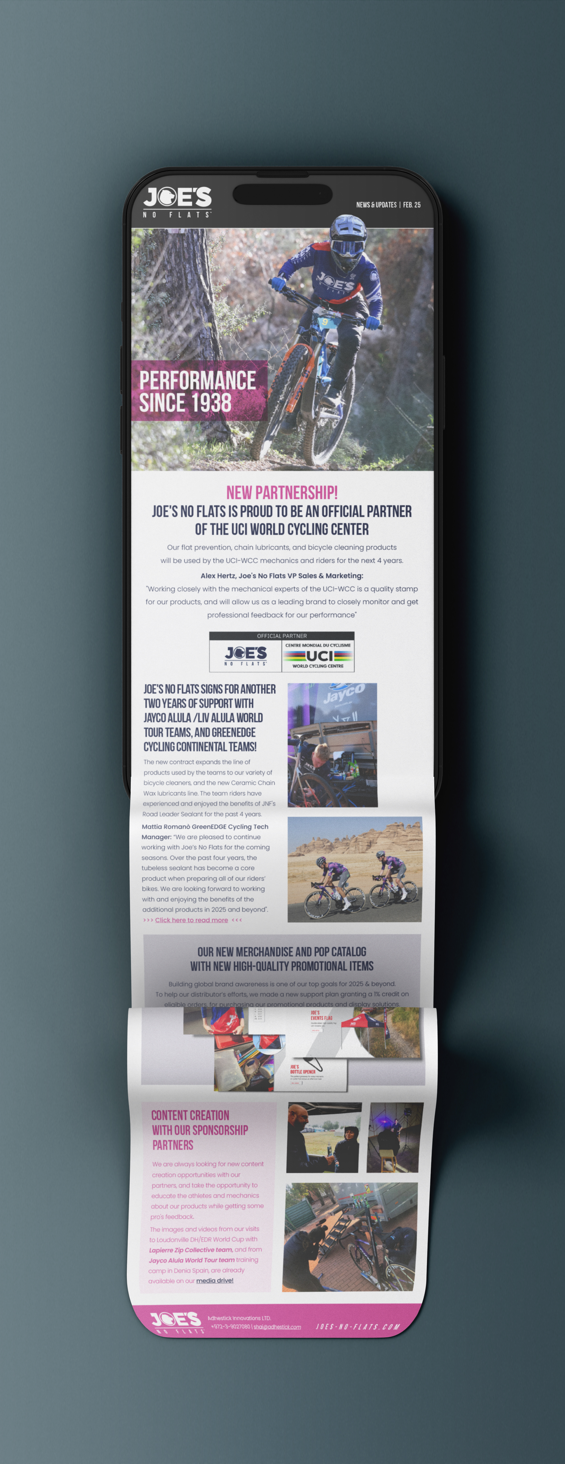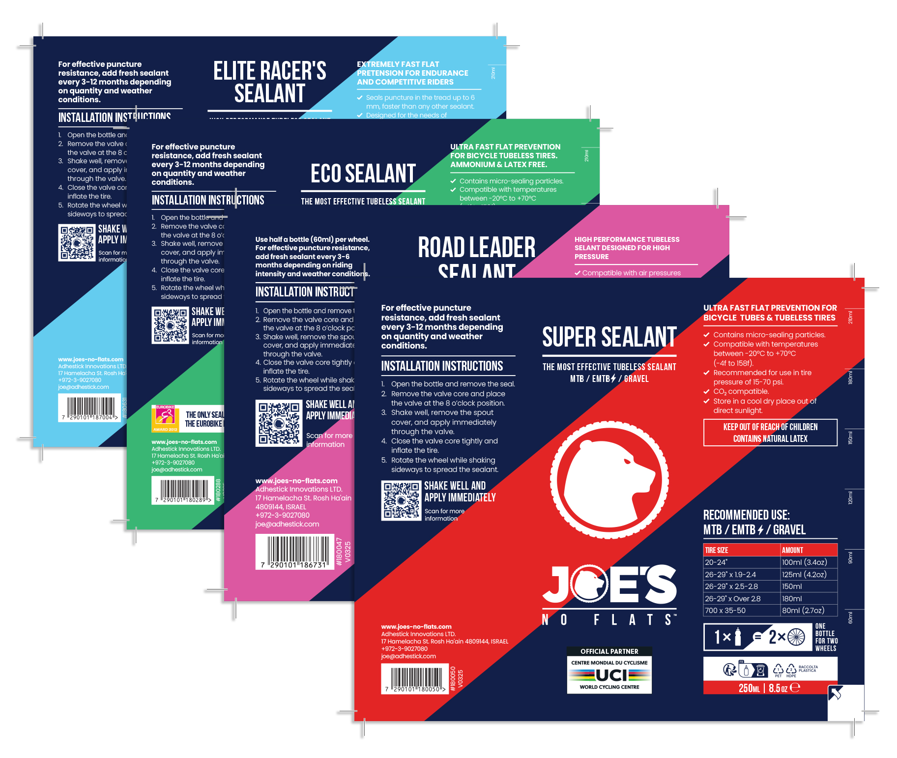 Joe's No-Flats מספקת לשוק האופניים את חומר האיטום עטור הפרסים והיעיל בעולם נגד פנצ'רים. קו המוצרים של החברה כולל חומרי איטום על בסיס לטקס, פתרונות ואביזרים ללא צינורות, צינורות אטומים, ערכות המרה ללא צינורות, חומרי סיכה המבוססים על טכנולוגיית הננו המתקדמת ביותר, חומרי ניקוי ומסירי שומנים מעולים ועוד. האיש הנכון שמח לשתך פעולה עם ג׳ו בעיצוב מחדש של מערך תוויות המוצרים, והניוזלטר החודשי הנשלח ללקוחות החברה.